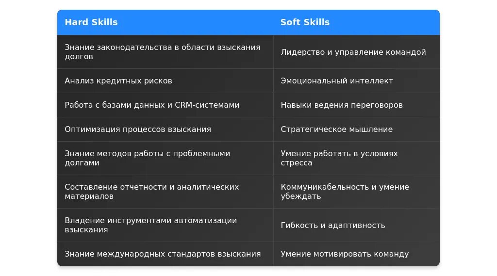 "Управление коллективом, разработка стратегий взыскания, знание законодательства."