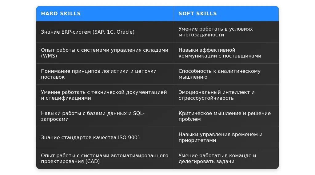 Вакансия 4: "Навыки работы с ERP-системами, умение планировать закупки." Обязательное требование — знание ERP-систем, а навыки планирования — желательное.