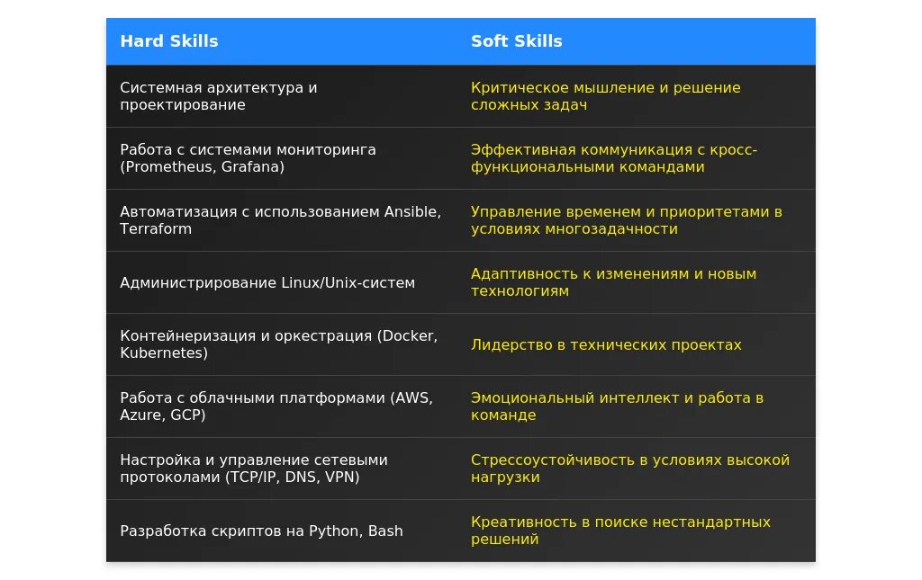 Ключевые навыки (например, "работа с системами мониторинга, автоматизация процессов, настройка серверов").