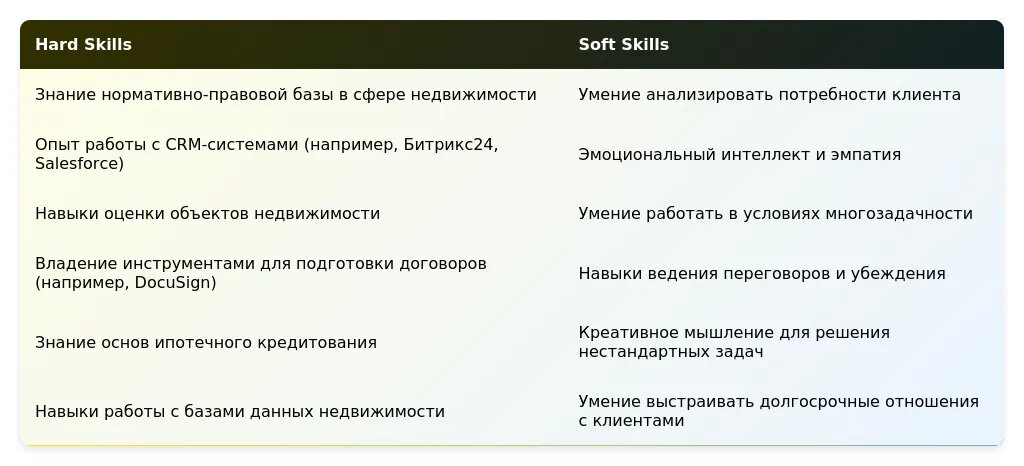 После адаптации: "Знание законодательства в сфере недвижимости, навыки работы в команде."
