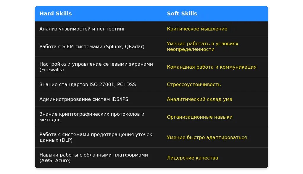 - Технические навыки: знание ОС, сетевых протоколов, основ криптографии.