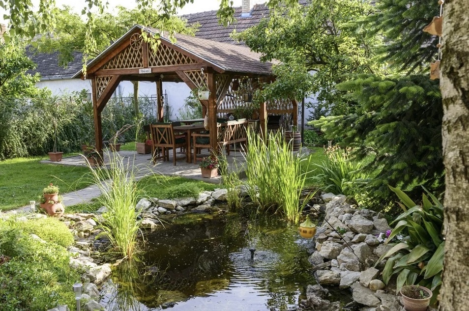 На берегу садового пруда можно обустроить зону отдыха с беседкой, шезлонгами или гамаками, поставить скамейку или плетёные стулья, которые помогут расслабиться и насладиться видом на водоём. Рядом с водой влажность воздуха становится выше, а температура снижается, что полезно для растений и отдыха.