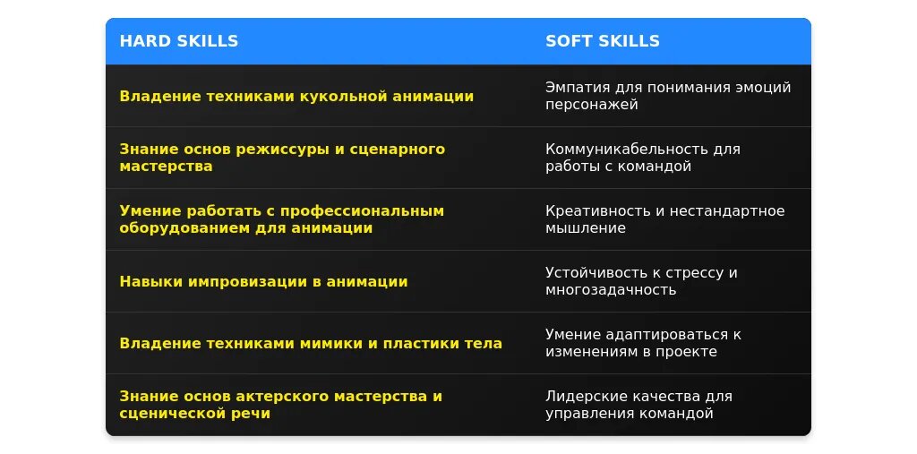 Личные качества (soft skills) играют важную роль в профессии актера-аниматора. Вот топ-10 важных качеств: