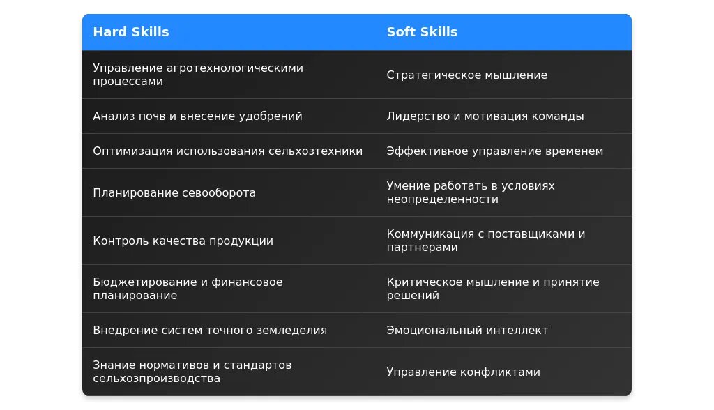 После адаптации: "Знание агротехнологий, опыт работы с сельхозтехникой, управление логистикой."