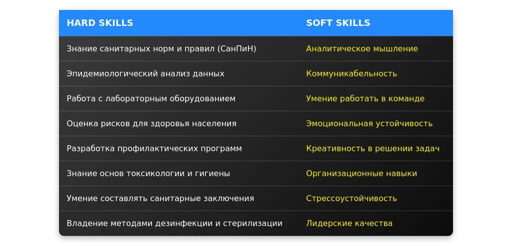 После адаптации: Знание СанПиН и ГОСТ, работа с лабораторным оборудованием, аналитические навыки.