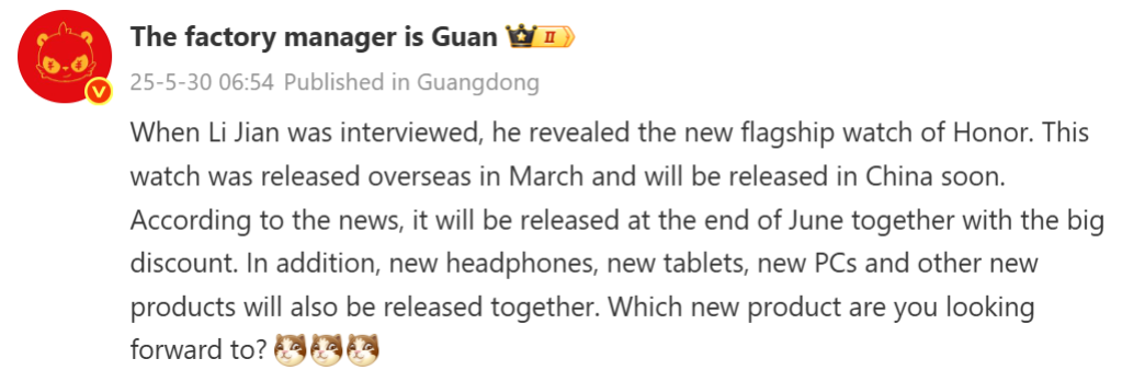 По словам информатора, генеральный директор Honor Ли Цзянь случайно показал предстоящие флагманские смарт-часы Honor. Эти часы уже были выпущены на международном рынке в марте, и теперь они должны появиться в Китае. В данном случае информатор, похоже, говорит о модели Honor Watch 5 Ultra, которая получила такие функции, как титановый корпус и ЭКГ в марте по всему миру.
