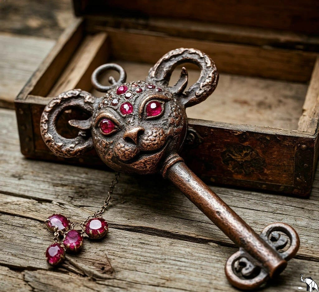 «Вернись» — прозвучало в голове. И этот призыв был настолько самоуверен и твёрд, что у Лены даже мысли не возникло ослушаться. Она робко взяла шкатулку в руки, открыла крышку, и снова увидела два светящихся красных глаза. Это они так сильно напугали её. Тогда Лена решила, что из шкатулки сейчас выпрыгнет исчадие ада. Но сейчас она присмотрелась внимательней, и с облегчением поняла, что это всего лишь рубины, сверкающие в тусклом свете фонаря. И эти рубины не просто так лежали в шкатулке. Ими был инкрустирован огромный древний ключ.