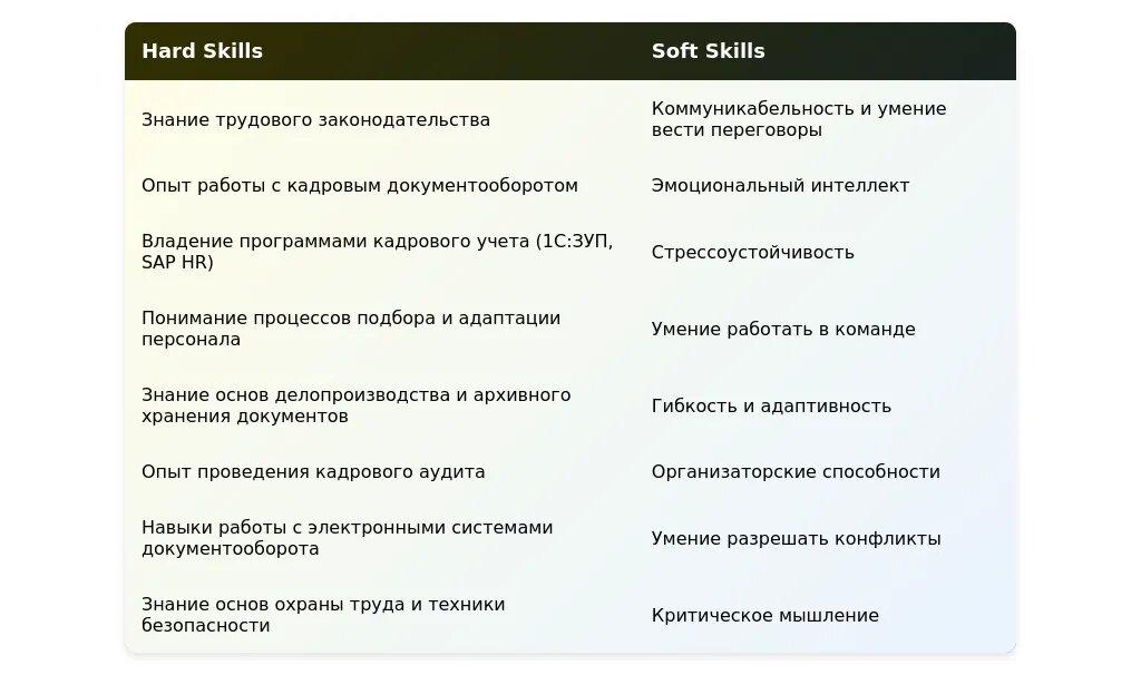 Навыки следует перегруппировать, чтобы выделить те, которые наиболее соответствуют требованиям вакансии. Используйте ключевые слова из описания вакансии, такие как "кадровый документооборот", "HR-системы" или "подбор персонала".
