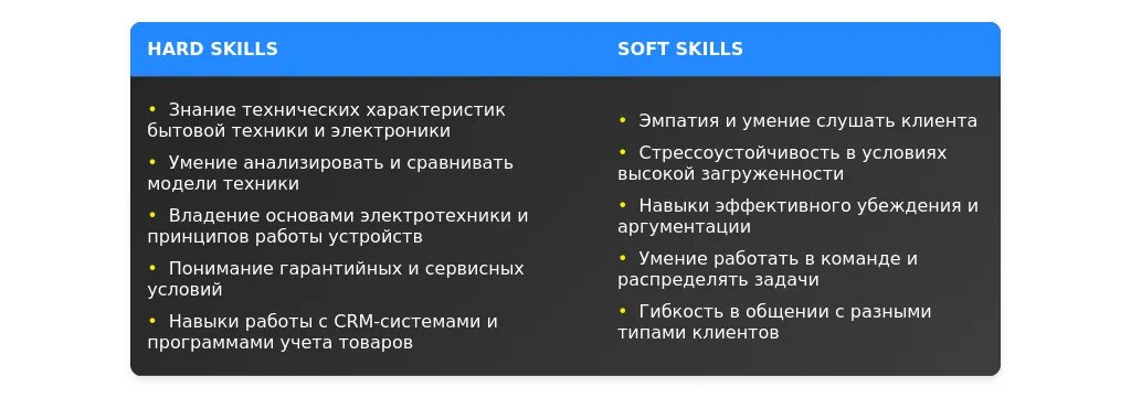 Знание ассортимента бытовой техники и электроники, умение подбирать товары под потребности клиентов.