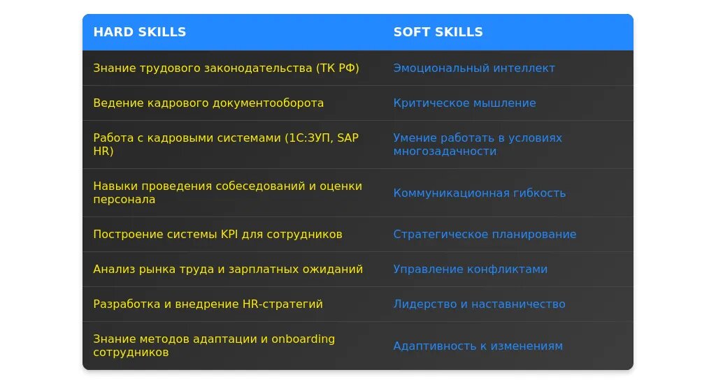 После адаптации: "Навыки работы с кадровыми системами (1С:Зарплата и Управление персоналом), знание трудового законодательства, опыт проведения собеседований".