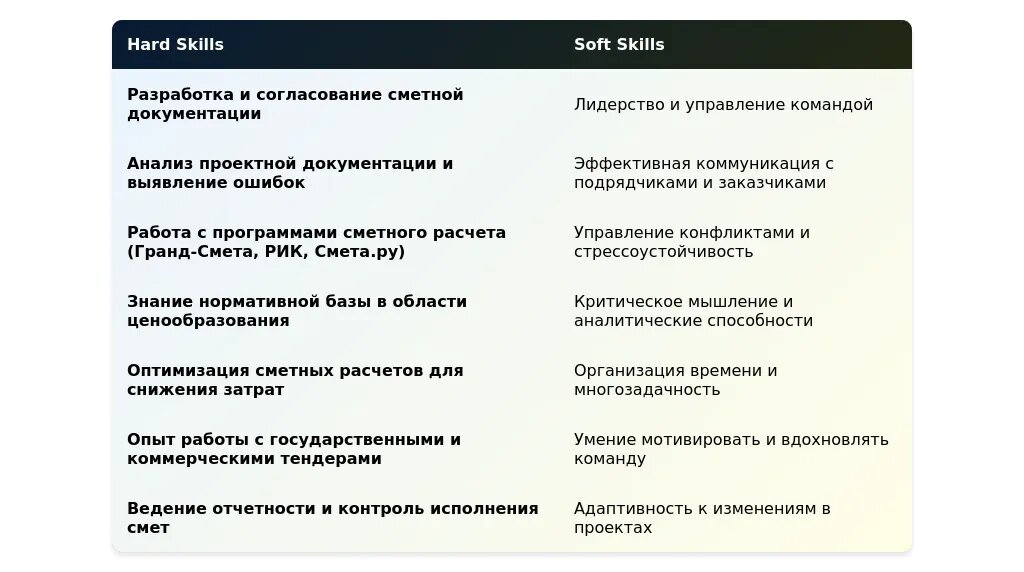 После: "Профессиональное владение Гранд-Смета, 1С:Смета, опыт управления командой, знание строительных нормативов."