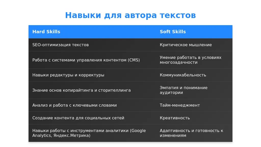 - Ключевые навыки (например, SEO-оптимизация, копирайтинг, редактирование).