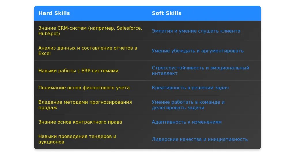 После адаптации: "Навыки продаж сервисных услуг, работа с корпоративными клиентами, ведение переговоров, использование CRM-систем (Salesforce, Bitrix24)."