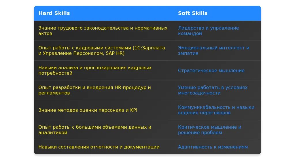 После адаптации: "Знание трудового законодательства, опыт внедрения HR-систем (1С:ЗУП, SAP HR), управление командой."