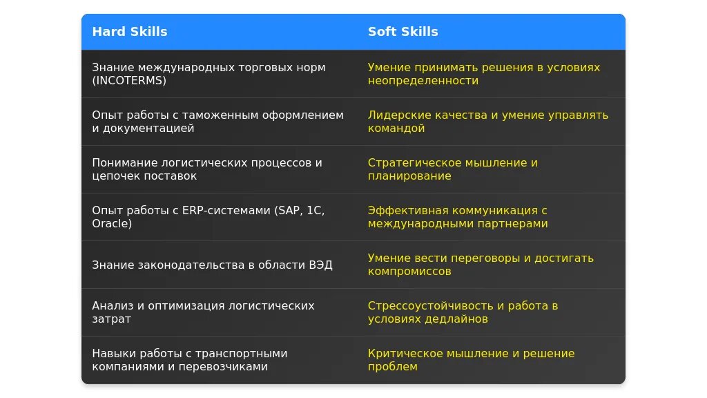 Навыки должны быть перегруппированы под требования вакансии. Выделите ключевые компетенции, такие как "знание Incoterms", "опыт таможенного оформления", "управление цепочками поставок". Используйте ключевые слова из описания вакансии, чтобы ваше резюме прошло автоматический отбор.