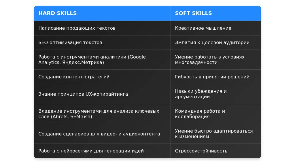 Пример 1: Плохо: "Навыки копирайтинга". Хорошо: "Навыки создания продающих текстов, SEO-оптимизации и работы с Tilda".