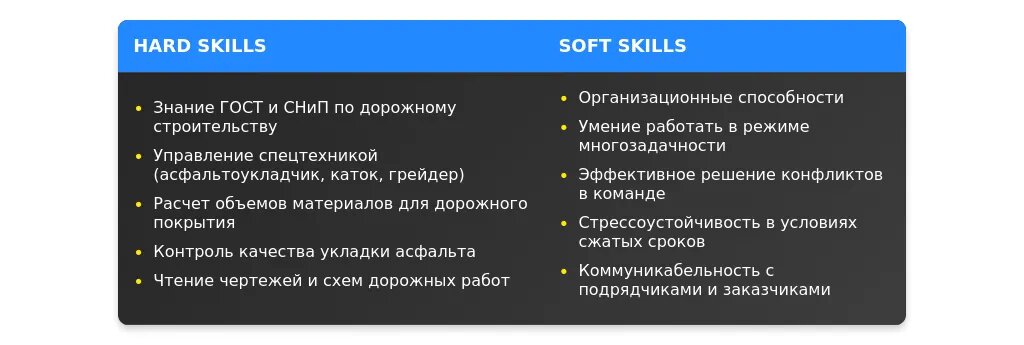 - Отсутствие ключевых слов — добавьте в заголовок и описание навыков слова, связанные с дорожным строительством.