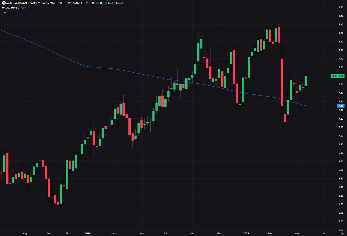 На протяжении текущего рыночного цикла долг с более низким рейтингом довольно последовательно превосходил как корпоративные облигации инвестиционного класса, так и суверенные облигации, включая казначейские обязательства. Для большинства это означало фокус на мусорных облигациях США, но это не единственная группа, которая преуспела. Облигации развивающихся рынков(EM), которые имеют большую часть с рейтингом ниже инвестиционного класса, также недавно превзошли себя. В некоторых случаях они показали себя особенно хорошо, учитывая, что они также получают попутный ветер от падающего доллара. Morgan Stanley Emerging Markets Debt Fund (MSD) использует относительно простой подход к инвестированию в эту сферу, но имеет дополнительное преимущество, поскольку ориентируется как на государственные, так и на корпоративные облигации. Учитывая, что эти две группы часто имеют разные профили кредитования, риска и доходности, объединение их в один продукт помогает диверсифицировать часть этого риска, п