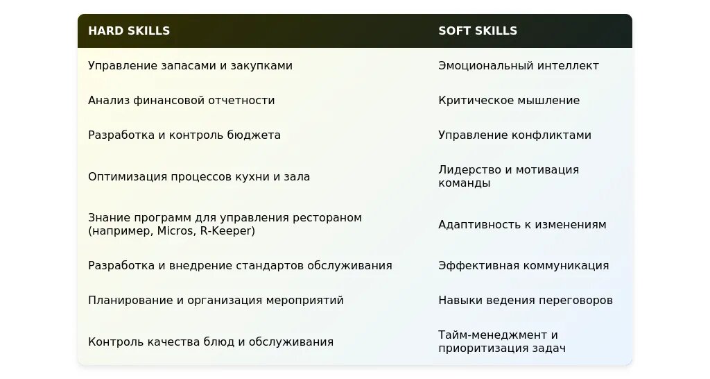 Технические навыки для заместителя управляющего рестораном