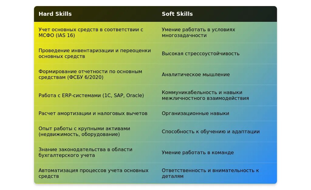 После адаптации: "Знание МСФО, опыт работы с 1С: Бухгалтерия, навыки подготовки отчетности по основным средствам."