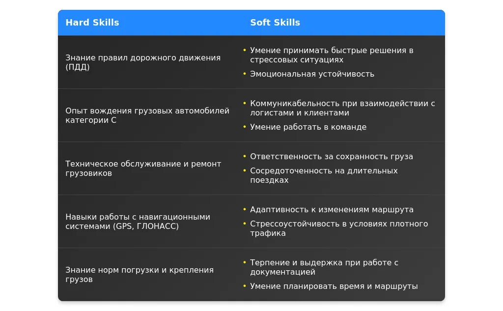 - **Навыки:** "Знание маршрутов", "Работа с документацией", "Соблюдение сроков доставки".