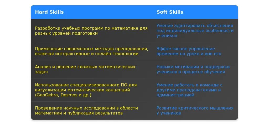 В разделе «Навыки» важно выделить ключевые компетенции, которые соответствуют вакансии. Например, если работодатель ищет преподавателя с опытом работы в онлайн-формате, стоит указать навыки работы с платформами Zoom или Google Classroom.