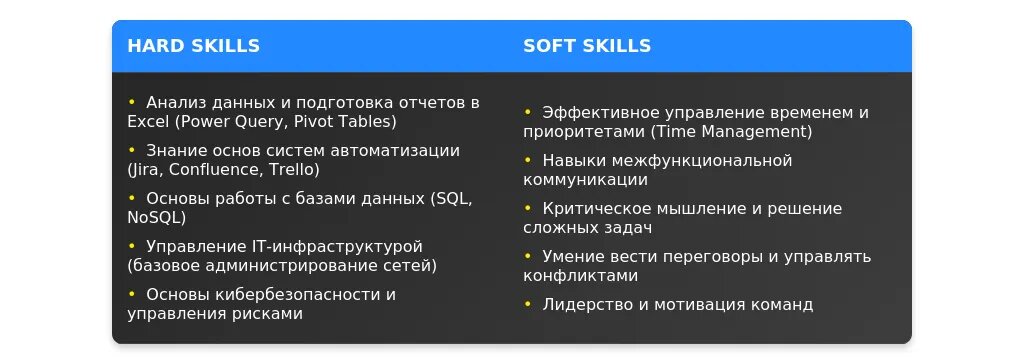 После адаптации: "Навыки работы с Microsoft Office, Jira, Confluence, базами данных."
