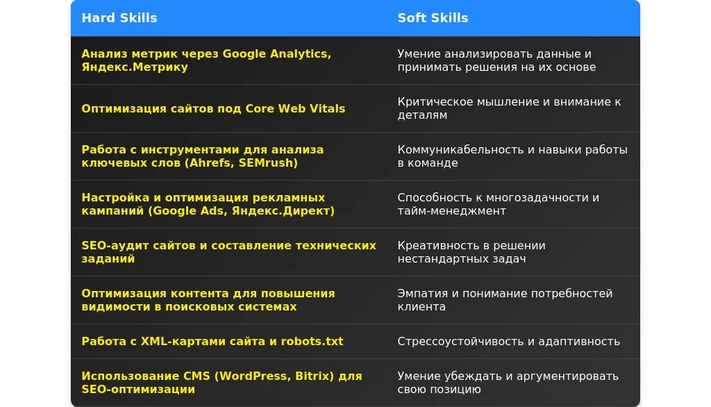 - На какие навыки делать акцент: Базовые знания SEO, работа с инструментами и аналитикой.