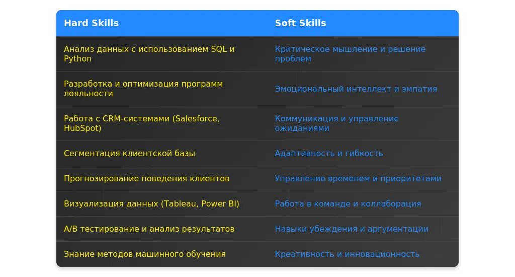 - Уникальные компетенции: Выделите редкие навыки, например: "Опыт работы с AI для прогнозирования лояльности."