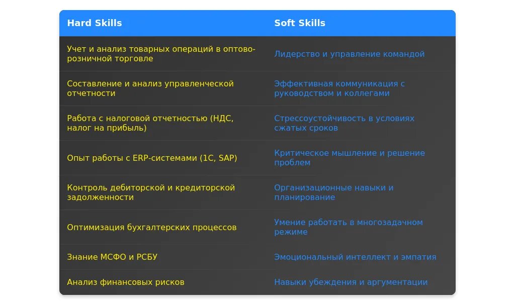Навыки следует перегруппировать так, чтобы ключевые компетенции, соответствующие вакансии, были на первом месте. Например, если вакансия требует знания МСФО, этот навык должен быть в начале списка.