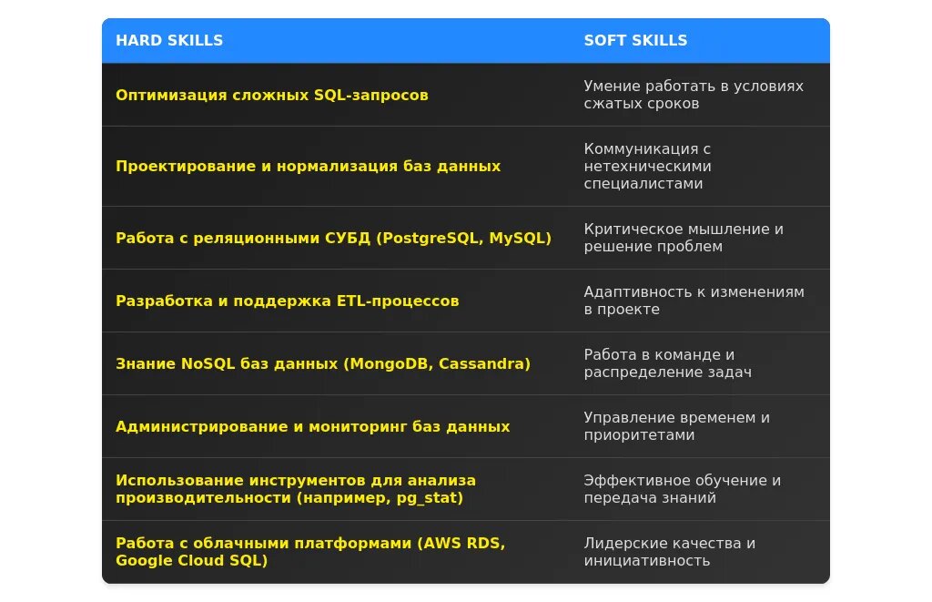 После: Навыки: PostgreSQL (опыт оптимизации запросов), MySQL, Python (автоматизация задач), Docker (развертывание баз данных).