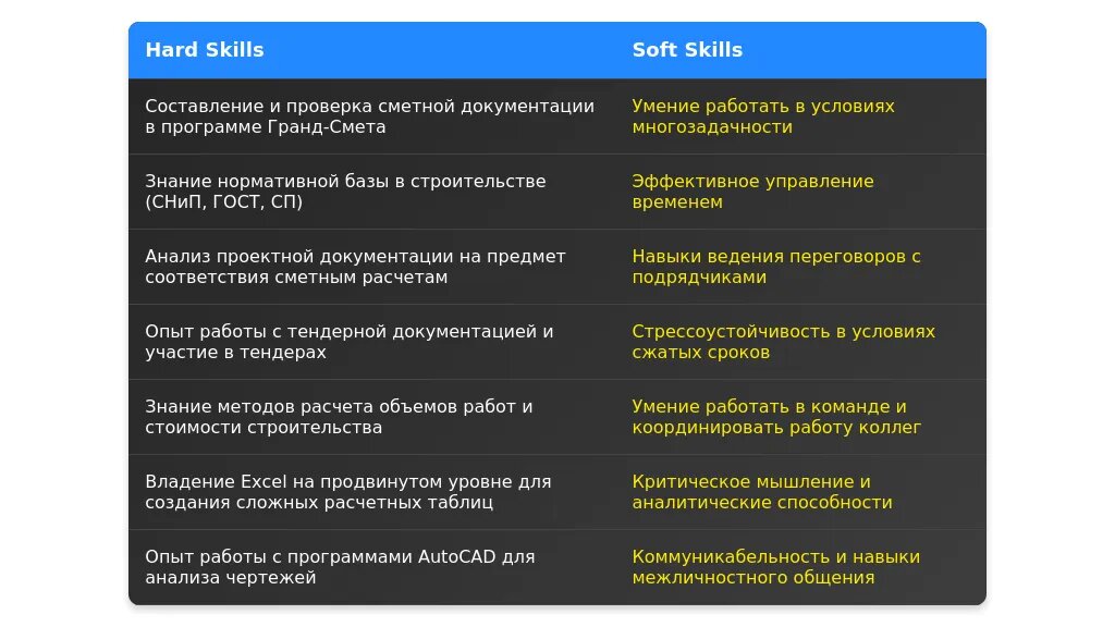 - Ключевые навыки, связанные с составлением смет, нормированием и расчетами.