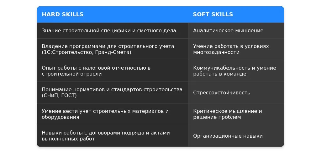 Сочетайте общие навыки (например, знание 1С) с узкими (например, ведение отчетности КС-2).