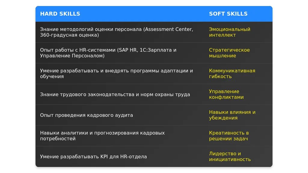 - Баланс навыков: Сочетайте широкий охват (например, управление командой) с глубокими знаниями (например, HR-аналитика).