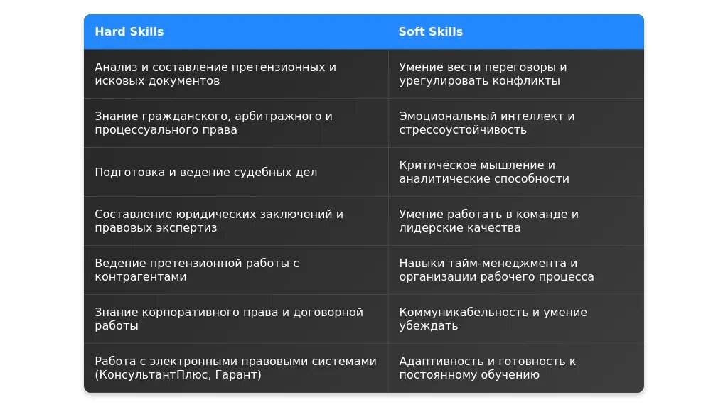 После адаптации: "Знание корпоративного и арбитражного права, опыт ведения претензионно-исковой работы, навыки подготовки исковых заявлений."