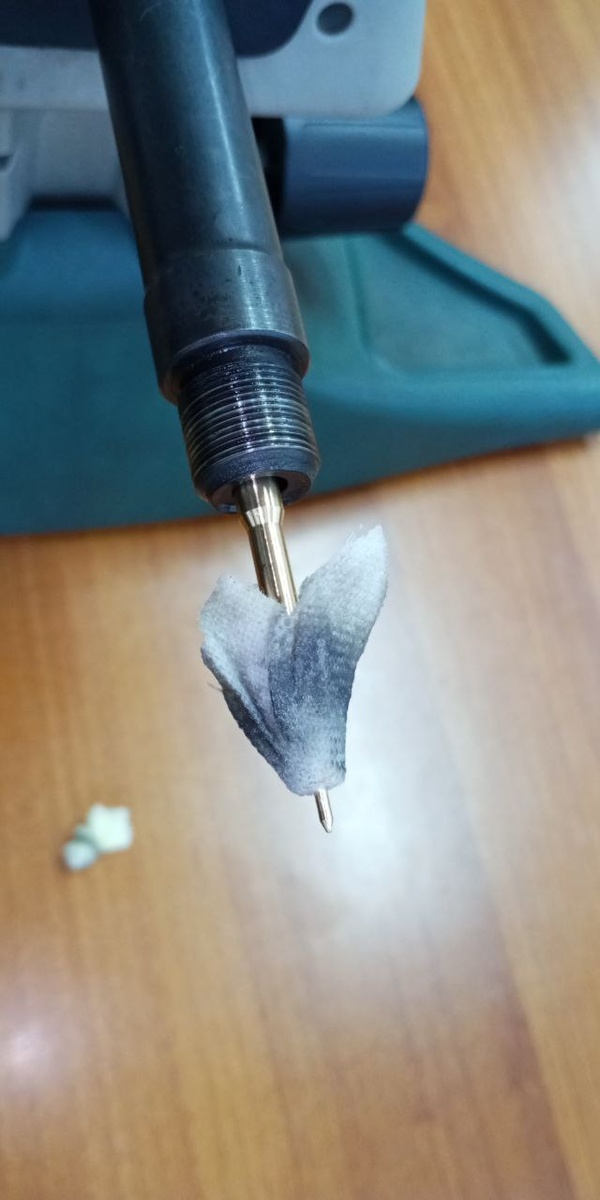 Кстати говоря об обслуживании. Пример "быстрого" варианта очистки, когда после нескольких выстрелов нет необходимости удалять накат меди, но нужно очистить от нагара. В данном случае, после нанесения комплексного очистителя-смазки, парой тканевых патчей-салфеток удаляются рыхлые слои нагара, затем, при помощи ерша совершается несколько проходов, после чего остатки загрязнений удаляются патчами. Мы использовали для этого войлочные патчи, пройдя канал ствола "с натягом". Контрольный патч вышел чистым и далее, в зависимости от необходимости, можно либо нанести смазку и поставить на временное хранение, либо сразу использовать оружие. Такой способ занимает совершенно немного времени и позволяет повысить сохранность оружия, особенно в условиях, когда после нескольких выстрелов необходимо по какой-либо причине сделать перерыв на некоторое время и не беспокоиться о процессах, связанных с воздействием кислотной среды на канал ствола.