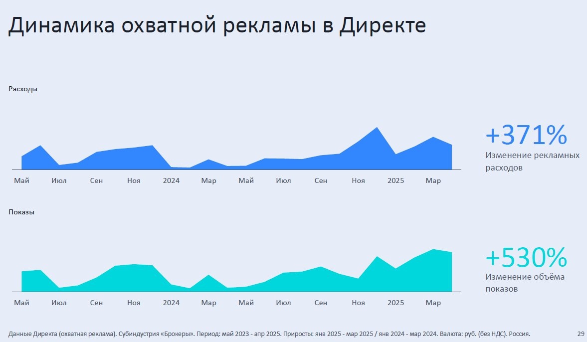 Готовясь к тендеру для одного из крупных заказчиков, мы попросили коллег из Яндекса собрать для нас макро-статистику по субкатегории финансовых брокеров. Бенчмарки хороши тем, что можно оценить, как в данной отрасли обстоят дела, и сравнивать со своими результатами.