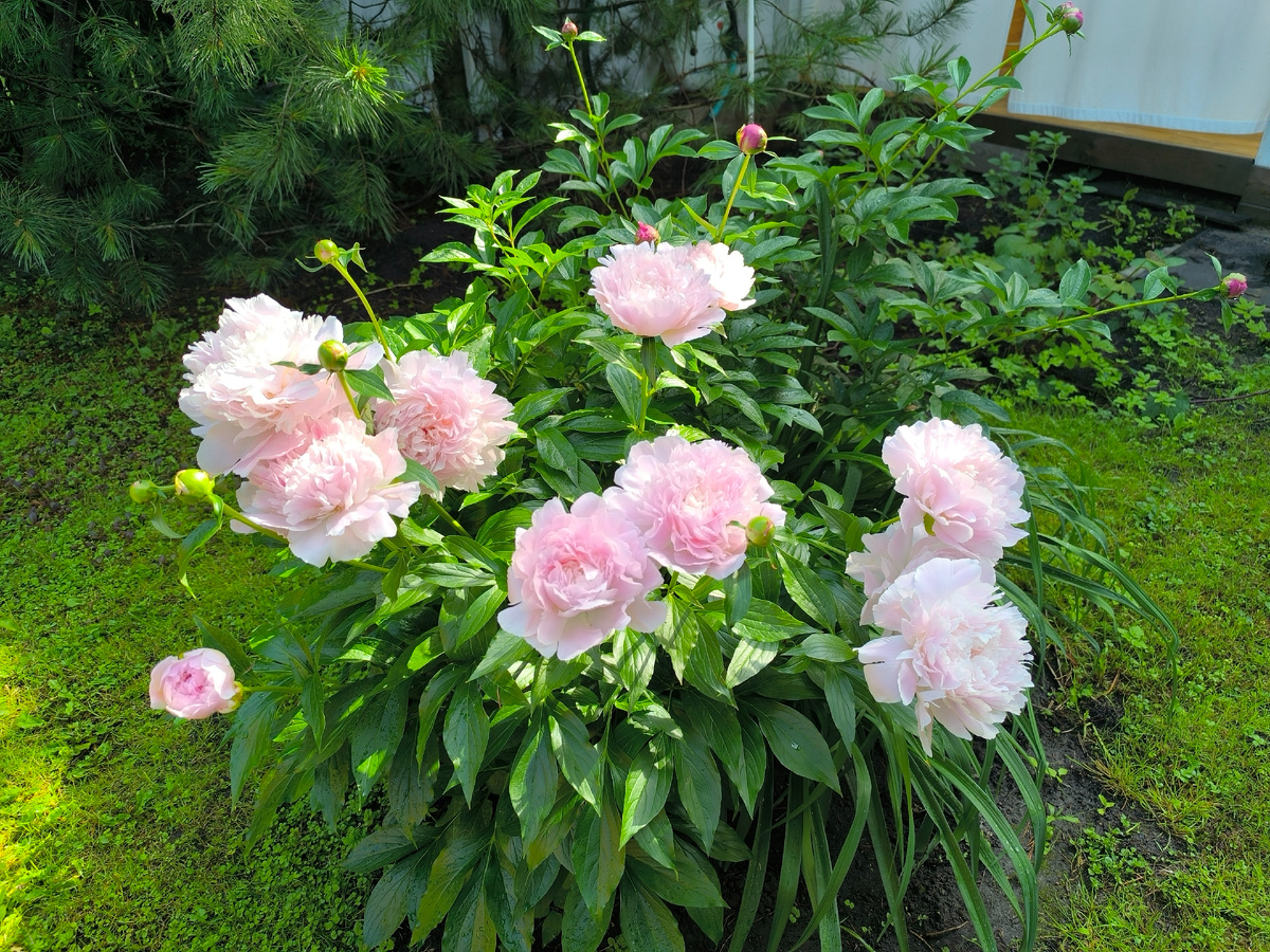 Около 8.00 часов выглянуло солнышко, я убрала зонт с пионов и узрела вот такую красоту. А какой аромат! Те читатели, кто читал заметки о предыдущих двух днях, знают, как носилась с пионами, чтобы бутоны не вымочило ливнями. Больше двух суток они простояли под обыкновенным зонтом, который держится на сушилке для белья. Это позволило сохранить цветы и полюбоваться ими сегодня при свете солнышка.
