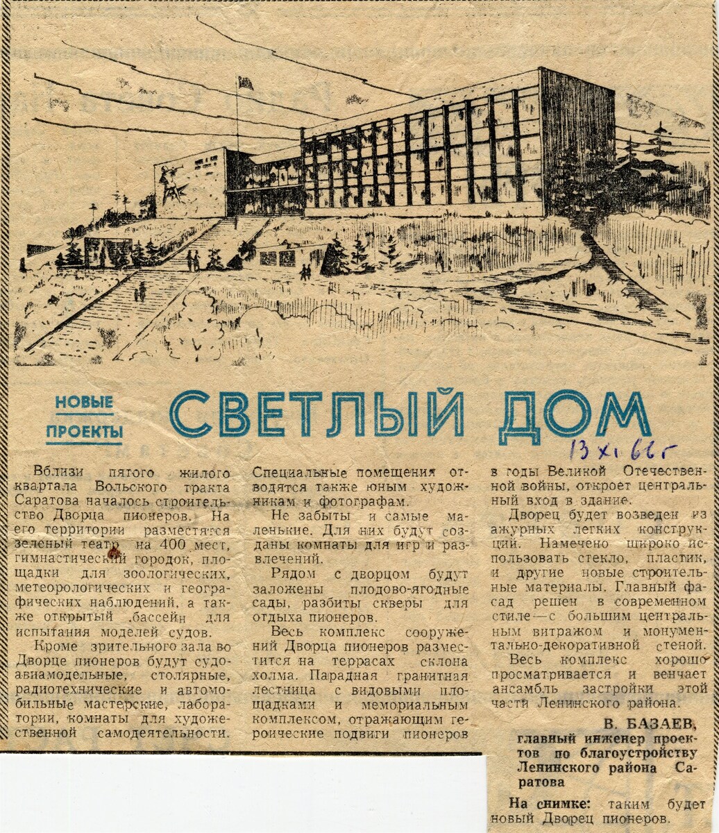 "Вблизи пятого жилого квартала Вольского тракта Саратова началось строительство Дворца пионеров. На его территории разместятся зеленый театр на 400 мест, гимнастический городок, площадки для зоологических, метеорологических и географических наблюдений, а также открытый бассейн для испытания моделей судов.