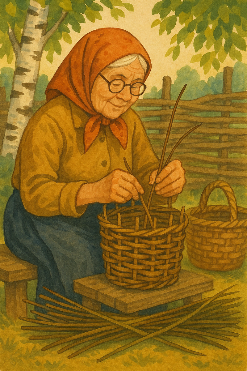 В ней несут грибы, сушат ягоды, прячут нитки и письма. Бабушки учили: «Сплетёшь дно прочно — корзина переживёт хозяина». Делимся их приёмами — без гвоздей и клея, только лоза, вода и терпение. Если ивы нет под рукой, можно заменить берестой: смотри, как собирали и работали с «кожей дерева» — https://dzen.ru/a/aCcZ91qIFFPwGPZt Связки держали трое суток в речной воде. Лоза набирала гибкость, а сердцевина оставалась плотной. Перед работой прутья сортировали: толстые — на дно, средние — на борта, тончайшие — на кромку-«замок». Совет бабушки: «Дно не должно гнуться, как сито. Поставь — и оно не покатится». Когда диск дна готов, спицы гнули вверх и плели «верёвочкой» в две лозы. Каждый новый ряд прижимали пальцами, чтобы не было щелей — ягода не высыплется, мелочь не потеряется. Последние десять сантиметров складывали в косу: прут вывели наружу, завели за соседний, кончик спрятали внутрь стенки. Кромка получается гладкой и крепкой, не распустится даже посл