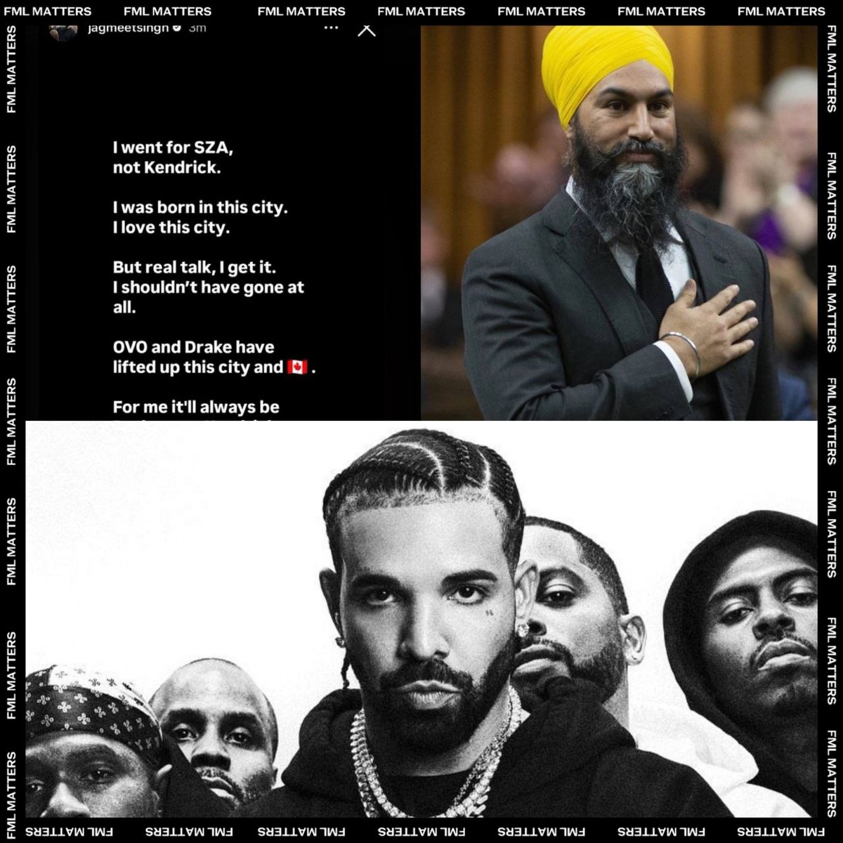 В ответ на пост ❗️ КАНАДСКИЙ ПОЛИТИК ОТВЕТИЛ DRAKE! Джагмит Сингх высказался после того, как Дрейк назвал его «дураком» за то, что он пошёл на концерт Кендрика Ламара в Торонто. «Я пришел из-за SZA. Но мне вообще не стоило туда идти. OVO и Дрейк подняли этот город и всю Канаду. Для меня Дрейк всегда будет важнее Кендрика» 💀 FML MATTERS