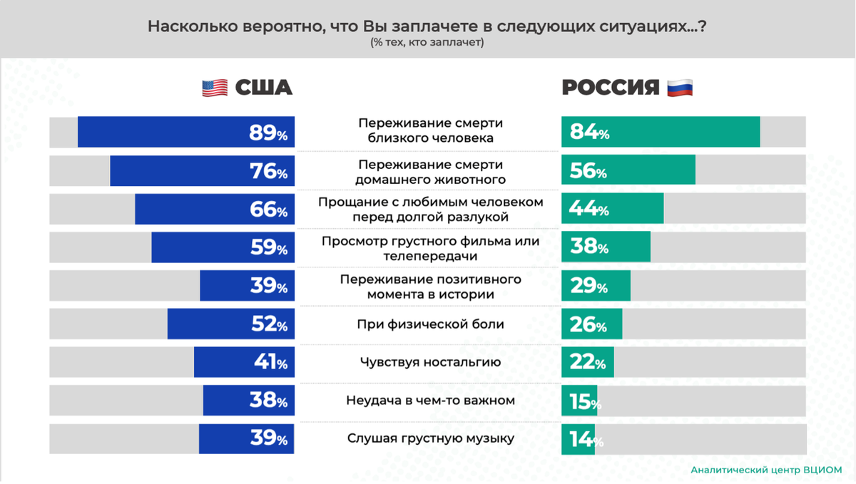 Американцы и россияне плачут по-разному: для россиян слёзы остаются «последним рубежом» эмоциональности, тогда как американцы воспринимают плач как повседневный способ поддержать психоэмоциональное равновесие. В течение недели до опроса плакали 40% опрошенных в США, а в России – только 28%. Топ-3 ситуаций, во время которых россияне прольют слезы: смерть близкого человека (84%, американцы 89%), смерть домашнего питомца (56%, американцы – 76%) и долгая разлука с любимым человеком (44%, американцы – 66%). Мужчины в России дают волю слезам в разы реже женщин, например, из-за неудачи в чем-то важном могут расплакаться четверть женщин, а среди мужчин только 5%. А каждый пятый мужчина считает маловероятным или невероятным расплакаться даже из-за смерти близкого человека (21% vs. 4% среди женщин).