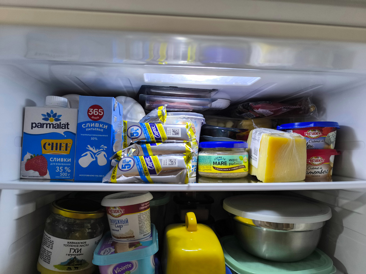Продолжаем играть в ревизорро. Мой холодильник всегда вызывает бурю дискуссий! Этот предмет кухонной техники практически является магнитом для идеальных людей, которые похоже обитают только на просторах интернета. А в магазинах на кассе смотришь на покупки людей и ведь хорошо если алкоголя нет. А так все как у всех и колбаса, и пельмени, и даже соусы с кетчупами. И ведь нормальные люди все, красивые, подтянутые, доброжелательные. А вот к ЗОЖникам конечно вопросики. Если полезная еда и отсутствие сахара делает человека таким агрессивным значит это тоже вредно? Ну да ладно, на эту тему можно рассуждать не один день, перейдем к самому виновнику статьи. Про мою систему экономии и почему у меня с таким бюджетом проскакивают деликатесы, можно прочитать в подборке перейдя по ссылке внизу. В моем холодильнике 4 полки, овощной отсек и полочки на двери. Наверное это стандартное наполнение такого типа холодильника. 1. Верхняя полка: Здесь лежит все чего не касался зуб человека, можно даже