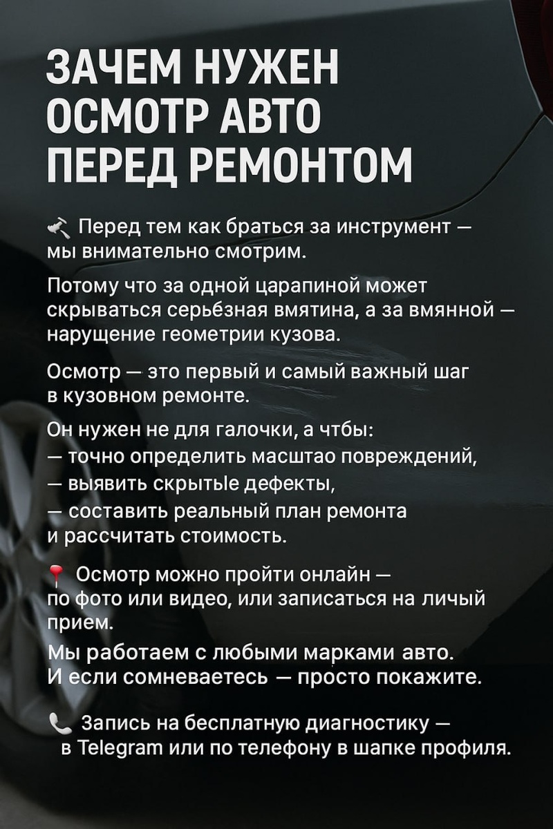 📌Зачем нужен осмотр авто перед ремонтом 🛠 Перед тем как браться за инструмент — мы внимательно смотрим. Потому что за одной царапиной может скрываться серьёзная вмятина, а за вмятиной — нарушение геометрии кузова. ⠀ 🔍 Осмотр — это первый и самый важный шаг в кузовном ремонте. Он нужен не для галочки, а чтобы: – точно определить масштаб повреждений, – выявить скрытые дефекты, – составить реальный план ремонта и рассчитать стоимость. ⠀ 📲 Осмотр можно пройти онлайн — по фото или видео, или записаться на личный приём. Мы работаем с любыми марками авто. И если сомневаетесь — просто покажите, мы подскажем. 📌Самый частый вопрос: «А мне точно нужно красить?». Ответим честно — после осмотра. 📞 Запись на бесплатную диагностику — в Telegram или по телефону в шапке профиля.
