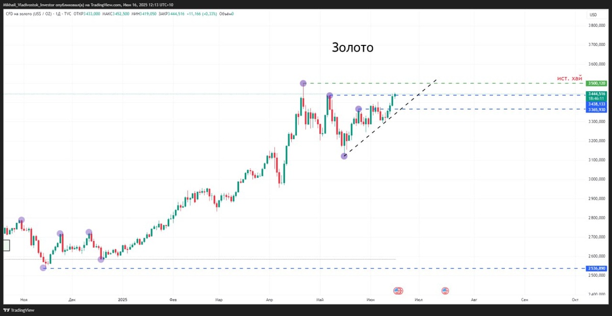 МЕТАЛЛЫ Золото GOLD $GDM5 Таймфрейм дневной Расторговывается боковике. На прошлой неделе мы вышли выше предыдущего максимума 3365 на фоне обострения конфликта на ближнем востоке. Если эскалация будет продолжаться и всё больше стран будет вмешиваться(особенно США), то есть вероятность даже обновления исторического хая. Опять же наблюдаем за индексами США. Если будем снижаться, то Золото с большей вероятностью перепишет исторический максимум. Платина $PTM5 Таймфрейм дневной Теперь можно уже транслировать дневной таймфрейм и рассматривать более детально картину. Очень резко и уверенно цена взлетела вверх. Не было каких-либо проторговок. Как правило, нам необходимо "отдохнуть и накопить топливо" для дальнейшего движения выше. Поэтому я сейчас буду наблюдать за коррекцией и потом уже принимать решение. Смотрим только от лонга. Палладий $PDM5 Таймфрейм дневной Мне нравится, что вышли из агрессивных продаж. Минимумы и максимумы повышаются. Была попытка на прошлой неделе закрепиться выше