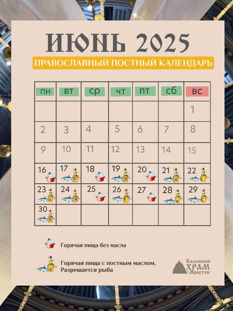↗ 🕊 Православный пост — не просто ограничение в пище, а время глубокой внутренней тишины и молитвы. ⠀ Мы собрали для вас удобный календарь на июнь 2025 год — чтобы каждый мог пройти этот путь осознанно, с вниманием к душе и телу. Позже подготовим для вас на июль месяц подобный календарь 🥰 📅Это не просто дата, это приглашение к духовному обновлению. В какие дни строгий пост, когда можно послабления. ⠀ Сохраняйте календарь себе и делитесь с близкими — пусть пост будет в радость и с пользой для души! ⠀ #православныйпост #церковныйкалендарь #постврадость #православие #пост2025 #казанскийхрам #батюшка38 Подробнее на vk.com