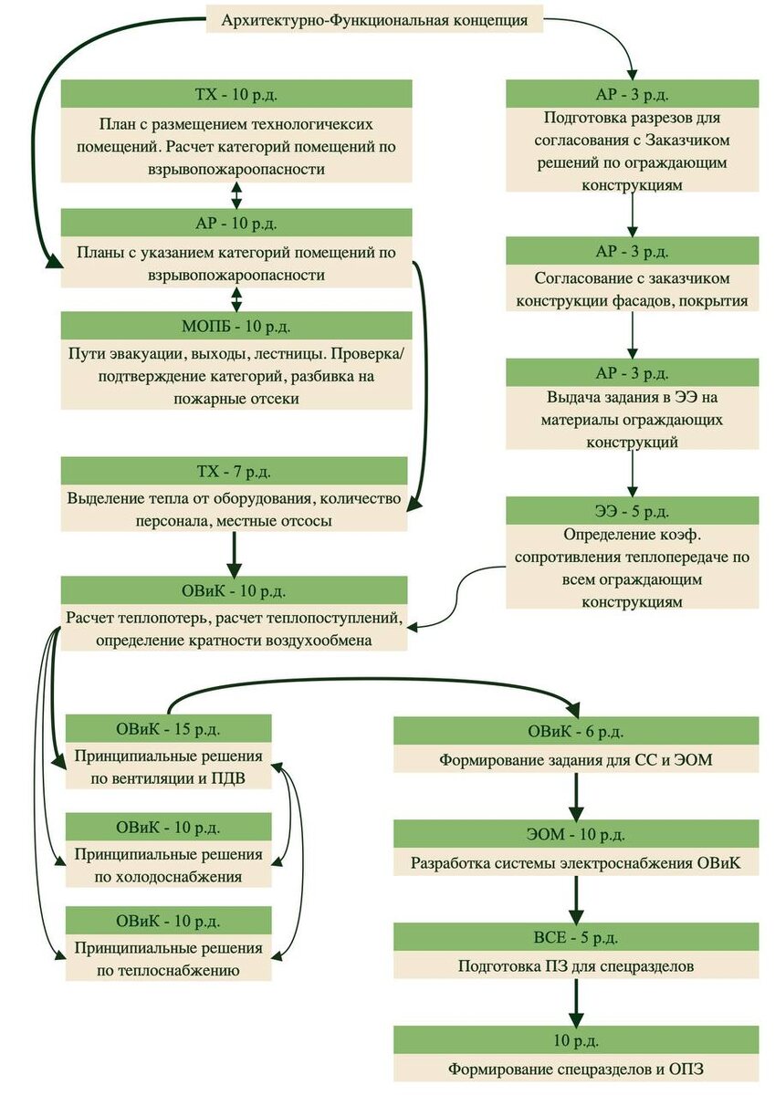 Критический путь На картинке представлено мое видение критического пути для стадии П. Я его использую для составления графиков, для представления и обоснования Заказчикам реальных сроков при внесении корректировок в середине пути, выполненного объема при приостановке проекта, для оценки трудозатрат и для составления отчетов по выполненным работам, например, для Технического Заказчика. Очень удобно, когда такой инструмент всегда под рукой, и вы последовательно ссылаетесь на него, демонстрируя его в общем графике на совещаниях. Теперь о принятых допущениях: 1️⃣ В данном случае принято, что концепция с функциональным зонированием уже есть, и не стоит задача насыщать здание новыми функциями. 2️⃣ Общий срок на стадию П порядка 15 недель. Конечно, здание может очень большим с разной технологией. Мой ориентир - многофункциональное здание площадью 70.000 - 80.000 кв.м. Это не значит, конечно, что для 100.000 кв.м. надо увеличивать сроки, скорее, нужно разделить некоторые работы внутри каж