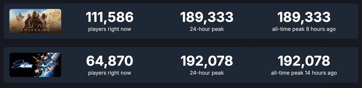 Сурвайвал-MMO Dune: Awakening, вышедшая 10 июня для всех игроков, и экшен Stellar Blade, вышедшая на ПК 11 июня, запустились практически без технических проблем. Успех обеих игр подтверждается впечатляющей статистикой – Dune: Awakening достигла пика в 189,3 тысяч одновременных игроков, а Stellar Blade привлекла 192 тысячи.