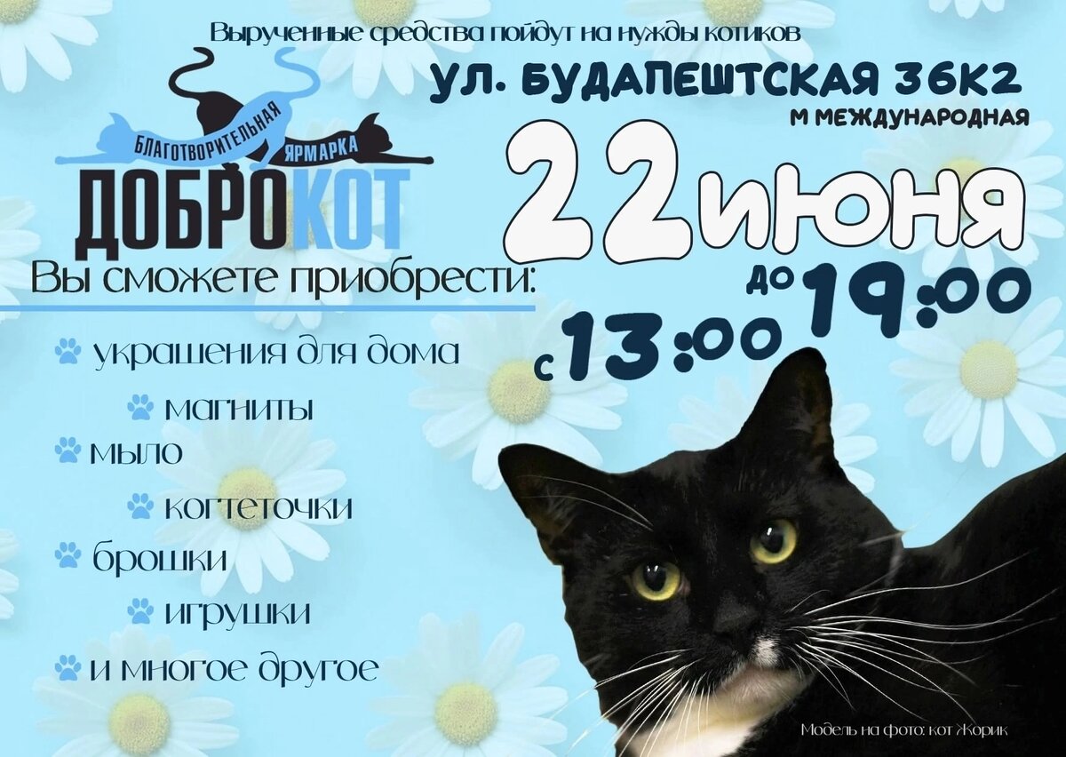 Привет, ромашки! Настал прекрасный сезон для ярмарки! 😸🎠🎡 --------------------------------------------------------------- Июнь месяц озорной, суетливый - непоседа окружённый всеми красками жизни. Летом ярмарка проходит активнее, в эту пору мы заметнее, размещаемся просторнее и работаем словно на солнечных батарейках😎🔋 🥳Поэтому перед самым красочным праздником выпускников "Алые паруса", мы приглашаем вас 22 ИЮНЯ 2025г на Благотворительную ярмарку "ДоброКОТ" 🥳 Скучали по ярмарке? Мы - да! Ведь ярмарка это: 1) возможность посетить приют; 2) познакомиться с нами и найти новые знакомства с творческими людьми 3) купить для себя или близких памятные подарки... А возможно найти на ярмарке что-то большее - своего четверолапого друга семьи! Что вас ждет на мероприятии, где кипит жизнь? Буквально всё, что можно пожелать: брошки и серёжки, вязанные игрушки, шопперы и авторские открытки, супер когтеточки и перины для пушистых животиков, стеллаж с книгами за пожертвование и многое-мн