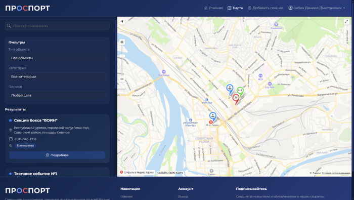 Выпускная квалификационная работа студентов — разработка онлайн «ПРОСПОРТ» поможет организации и поиску спортивных мероприятий. Идея проекта возникла на волне стремительного роста активности населения в физическую культуру и спорта. За последние пять лет только в Республике Бурятия их стало почти вдвое больше. Можно отметить и рост различных спортивных мероприятий. Сейчас информация о проводимых спортивных мероприятиях рассеяна по соцсетям, а регистрация идёт «вручную». Платформа «ПРОСПОРТ» собирает всё на одной карте, позволяя за минуту найти ближайшее событие или объявить своё. Помимо карты, на платформе имеется витрина, которую можно мгновенно отсортировать по дате, рейтингу или стоимости, а после записаться на интересующее мероприятие, найти магазин или подобрать секцию. Первый минимальный прототип уже выдержал нагрузочные испытания. Базовая версия будет бесплатной, монетизация строится на комиссиях и премиальных подписках. - По расчётам, платформа выйдет на самоокупаемость через 1